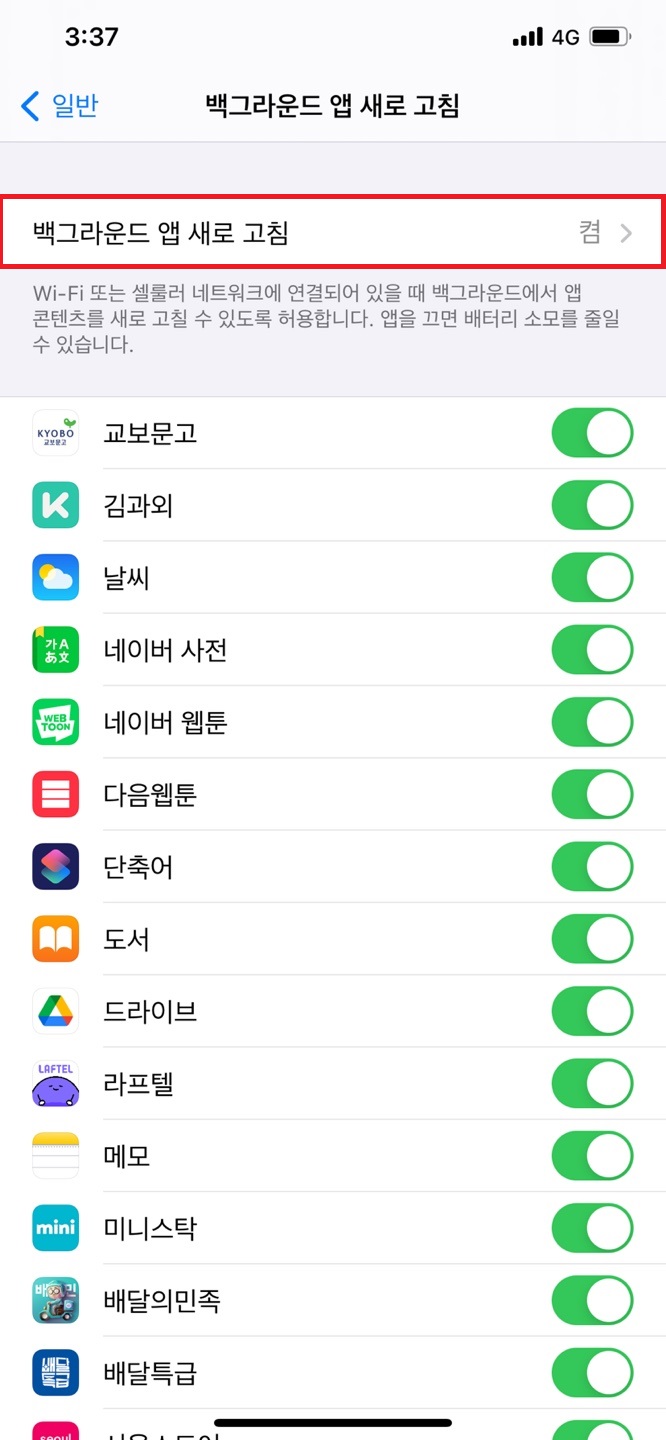 그 다음 백그라운드 앱 새로 고침을 탭하여 끄거나 Wi-fi를 통해서만 실행되도록 선택해주십시오.