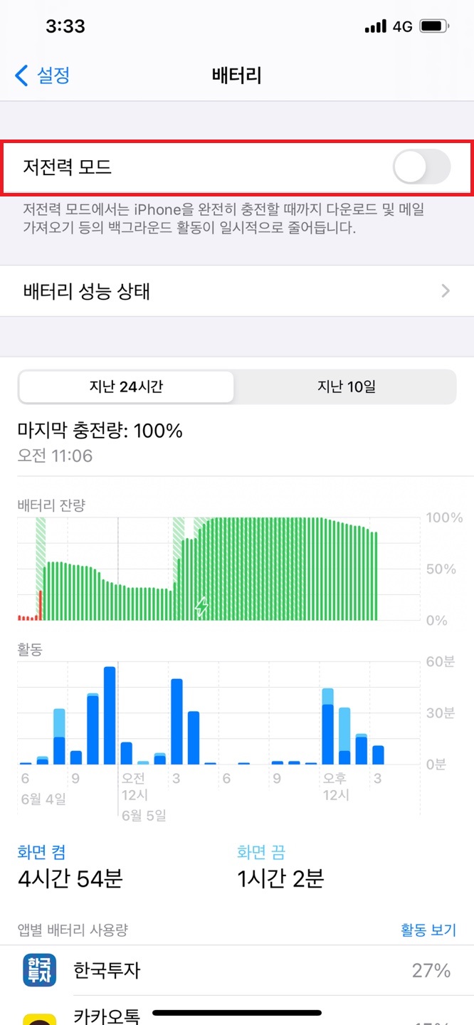 배터리 소모를 막아주는 가장 효과적인 방법 중에 하나는 저전력 모드입니다.
