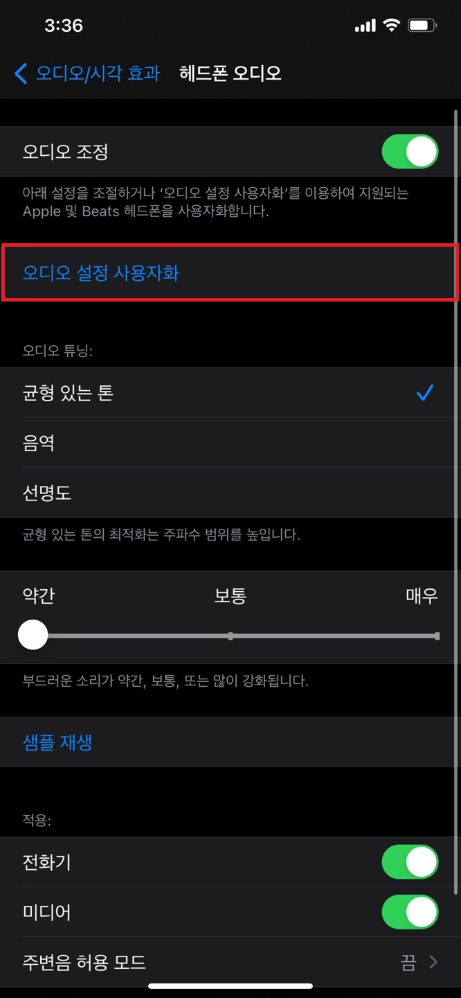 샘플 재생을 탭하면 샘플 오디오를 들으면서 오디오의 톤, 음역, 선명도를 조정할 수 있는데요.
