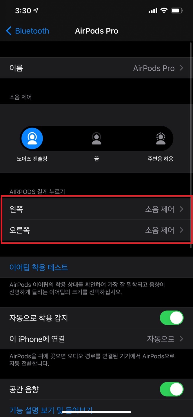 설정 - 블루투스 - 에어팟 프로 정보 아이콘 - AIRPODS 길게 누르기로 이동해주세요.