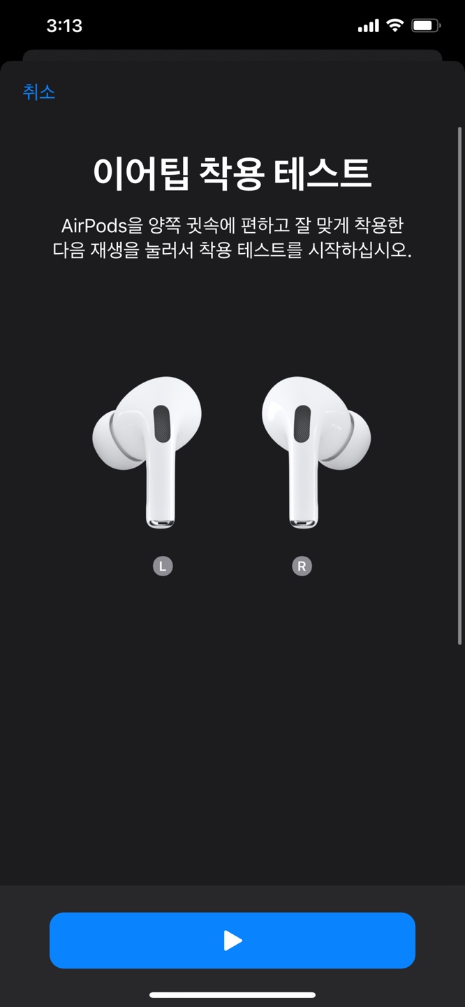 아이폰에서 설정 - 블루투스 - 에어팟 프로 정보 아이콘 - 이어팁 맞춤 테스트을 통해 실행할 수 있습니다.