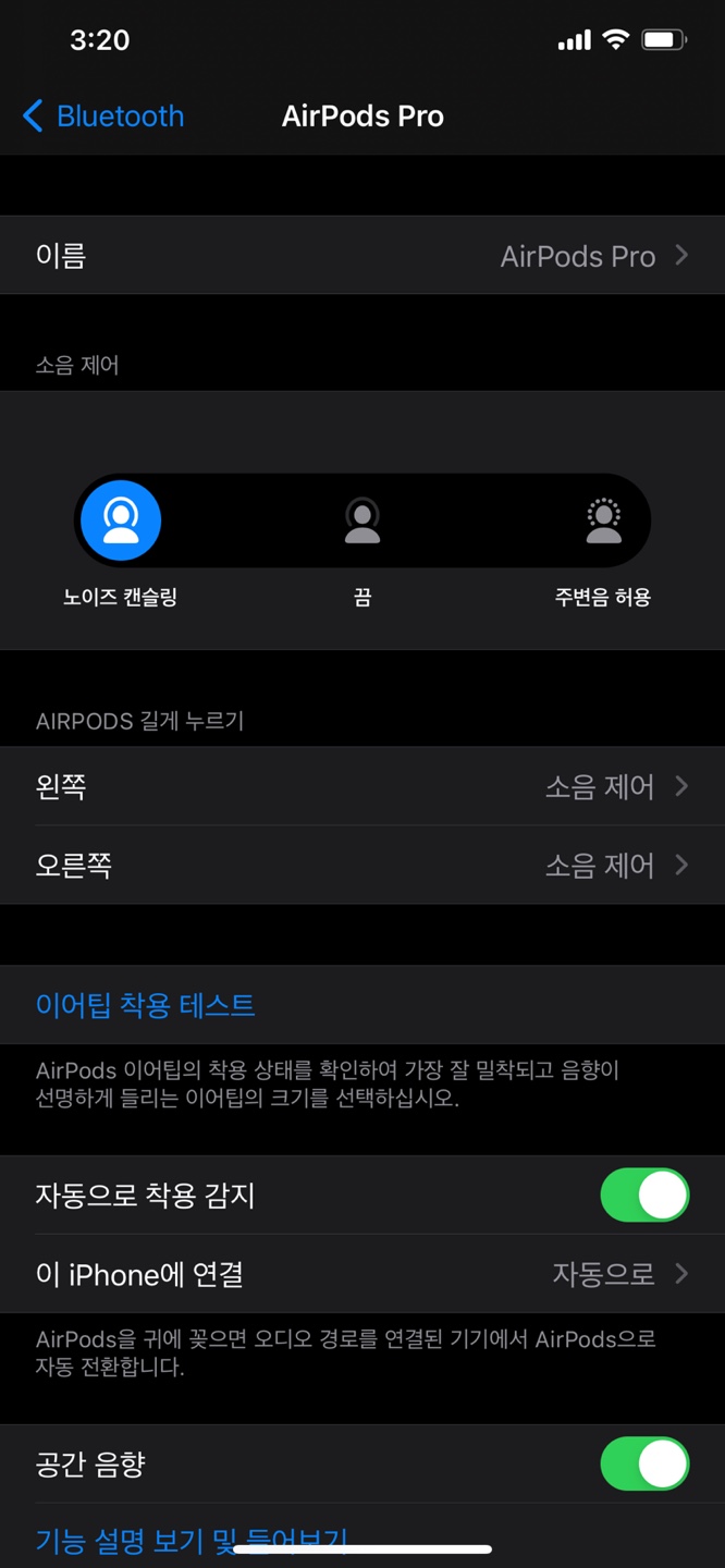 이 또한 iOS 14의 새로운 기능이자 에어팟 프로의 고유한 기능인데요.